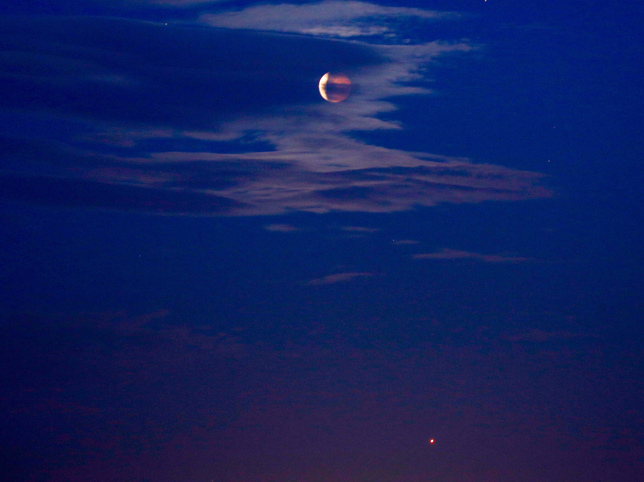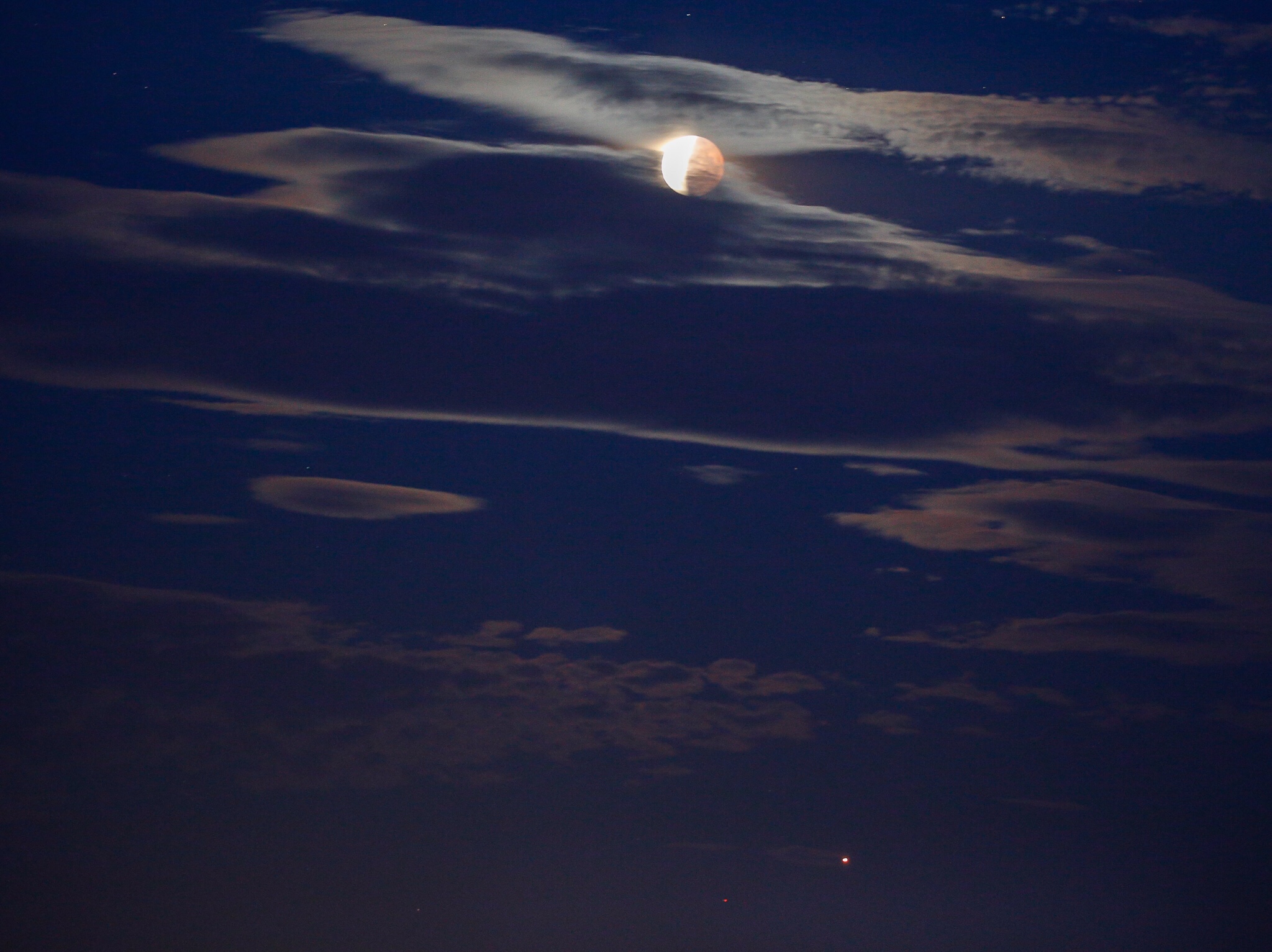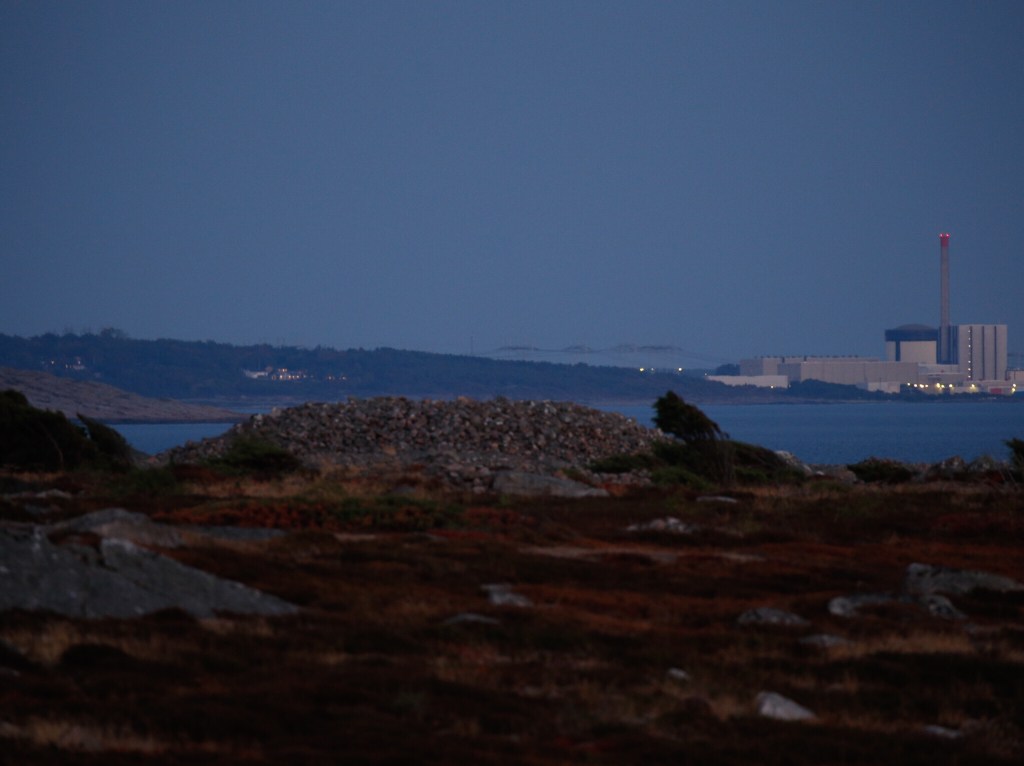 Så kom vi fram till några stenhögar, som egentligen är bronsåldersgravar. Här hade vi utsikt åt rätt håll. Här fanns också ett par som hade lyckats bättre med planeringen, med kamera och långt objektiv på stabilt stativ och mobilen som fjärrkontroll. Jag fick hjälp att upptäcka månen trots allt dis och moln vid horisonten. Efter några försök med handhållen kamera så placerade jag kameran på berget med kameraväskan som stöd och lyckades något så när få in skärpan. Exponerade i 4 s på f 5,6 men bilden blev ändå underexponerad. Brännvidd 400 mm.