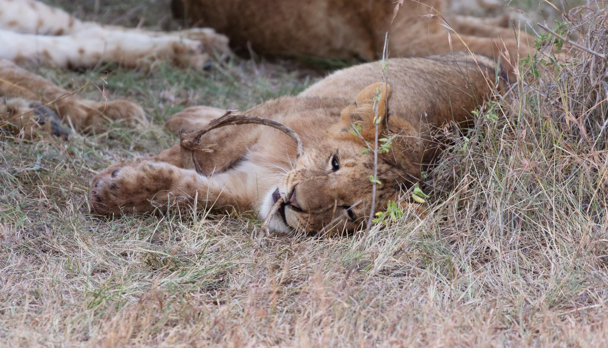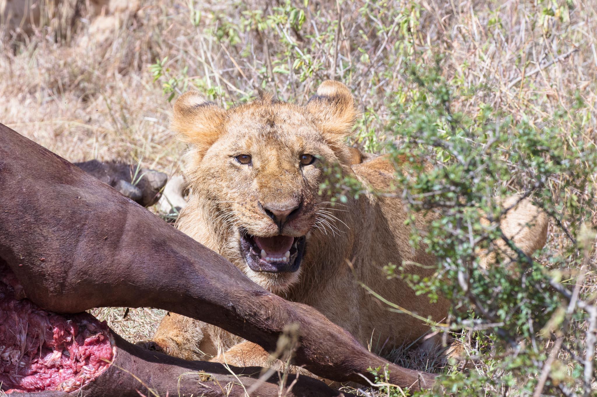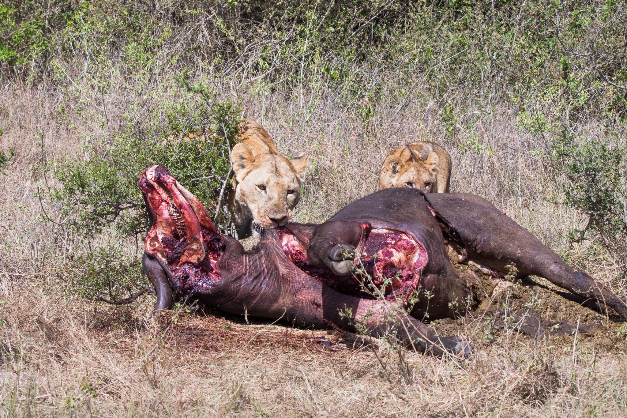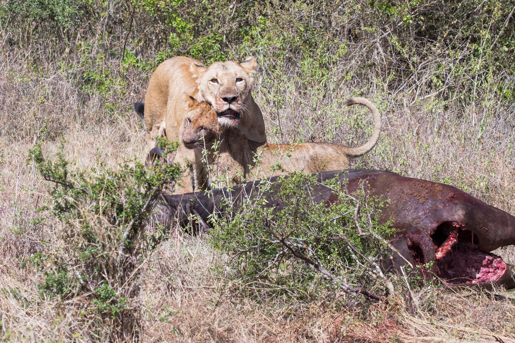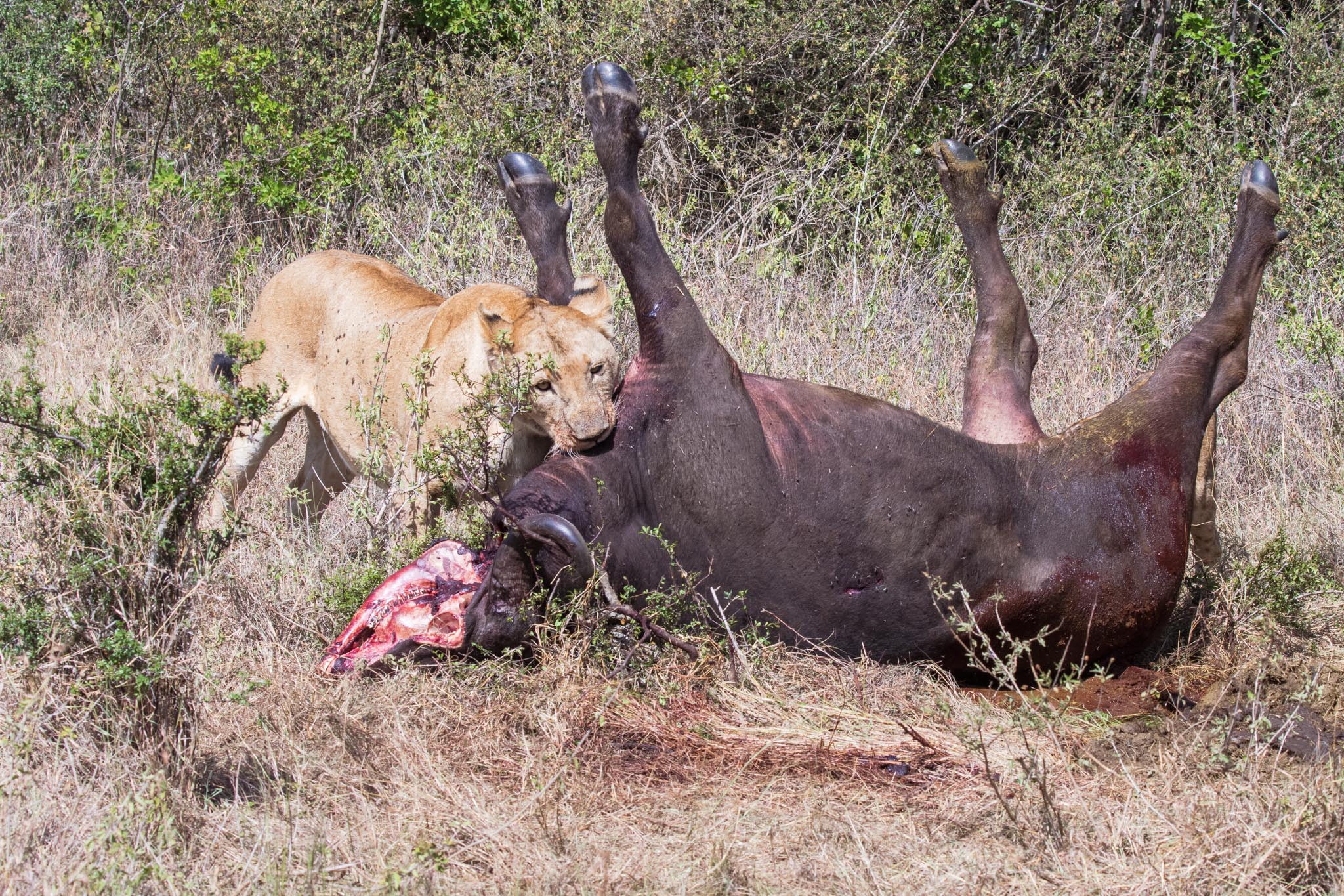 Vid högplatån hade lejonen haft en lyckad jakt, en vattenbuffel räcker till hela flocken så de håller sig mätta halva veckan.