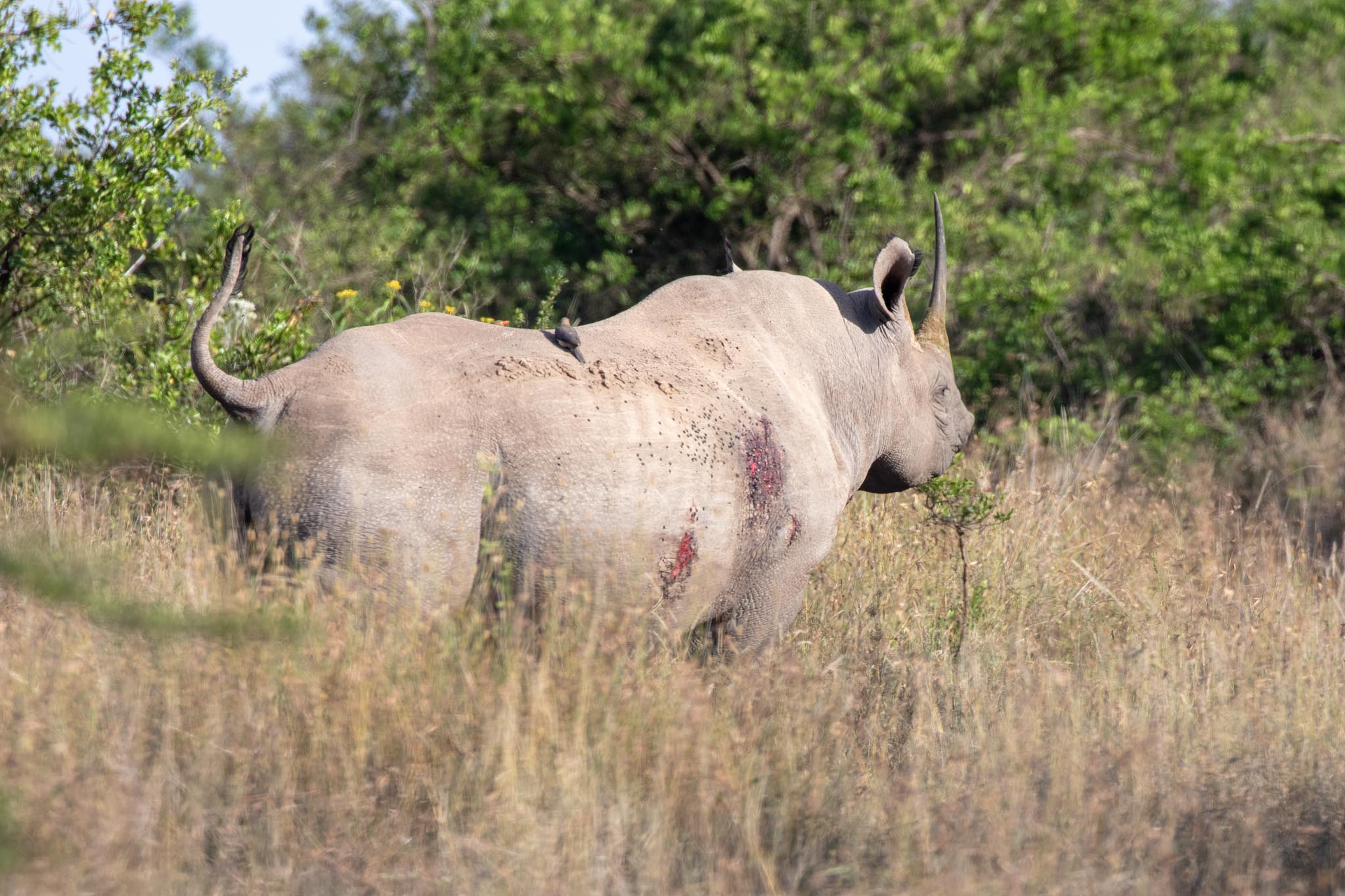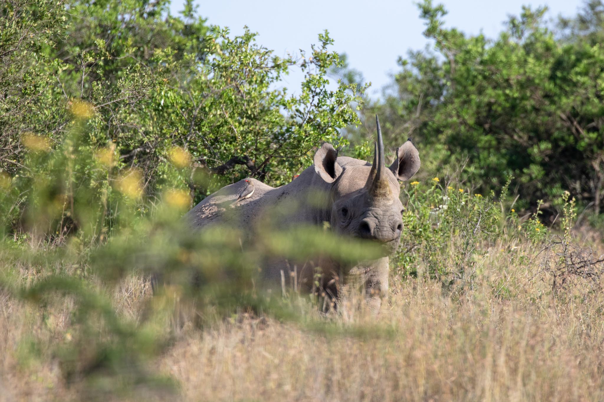 Detta är en Spetsnoshörning (Diceros bicornis) eller svart noshörning som den också kallas trots att den inte alls är svart. Den drabbades hårt av tjuvjakt redan på 1970-talet, då efterfrågan ökade på knivskaft av noshörningshorn. På den tiden fanns det upp emot 100 000 spetsnoshörningar i Afrika. I dag återstår ungefär 5.000 individer och arten är akut hotad. Ett privilegium att få möta dem ute i naturen. Vi måste verkligen göra allt vi kan för att få ha dem kvar. Om man bara kunde få stopp på efterfrågan av noshörningshorn….