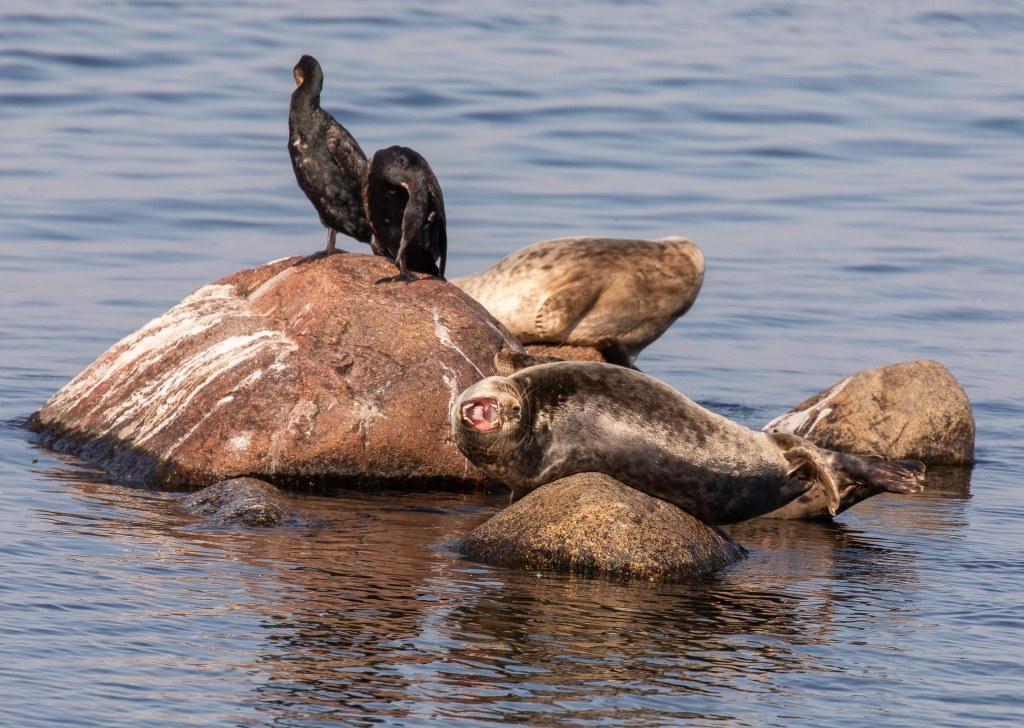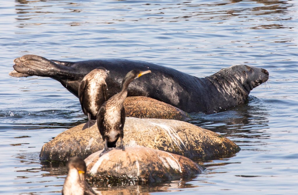 Här var det storskarvarna som bestämde, sälen fick vackert simma iväg.