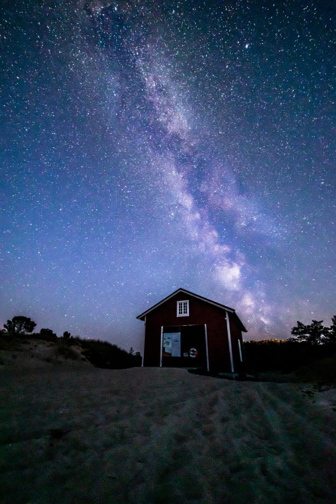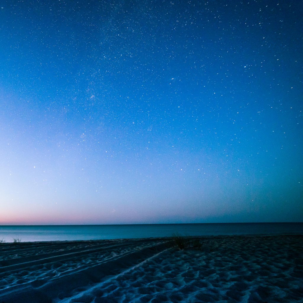 Vy åt norr ut över havet, man kan se vår närmaste galax Andromeda och Pleiaderna vid horisonten.