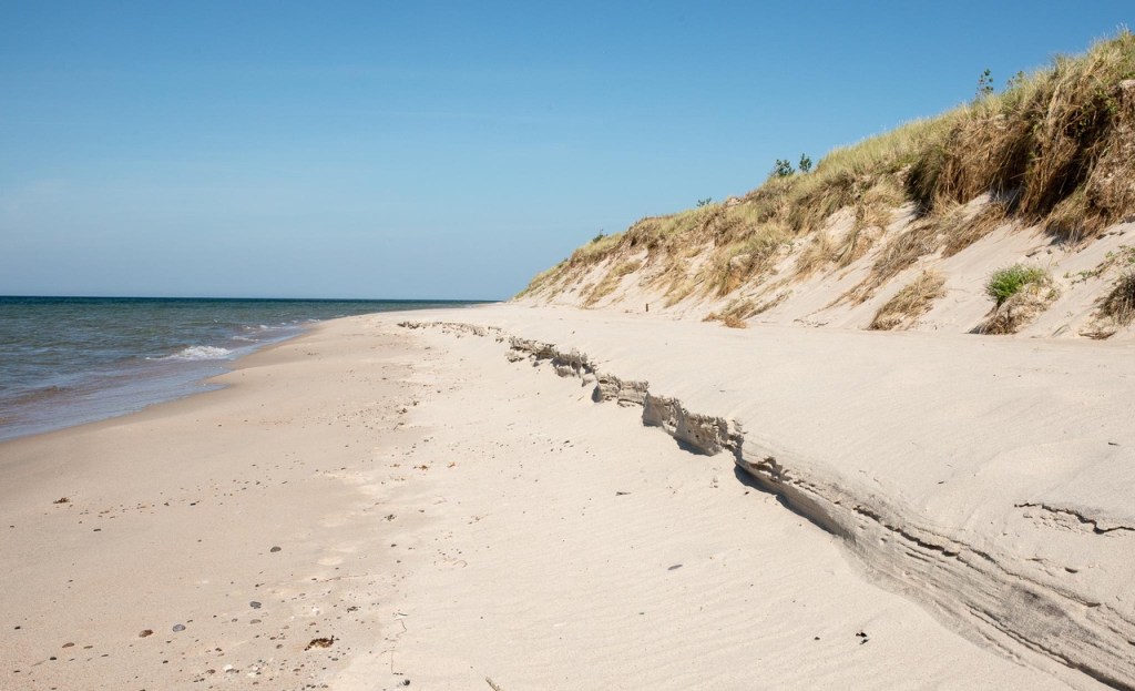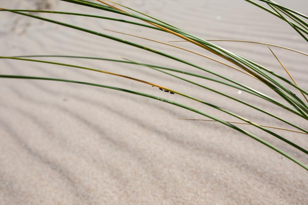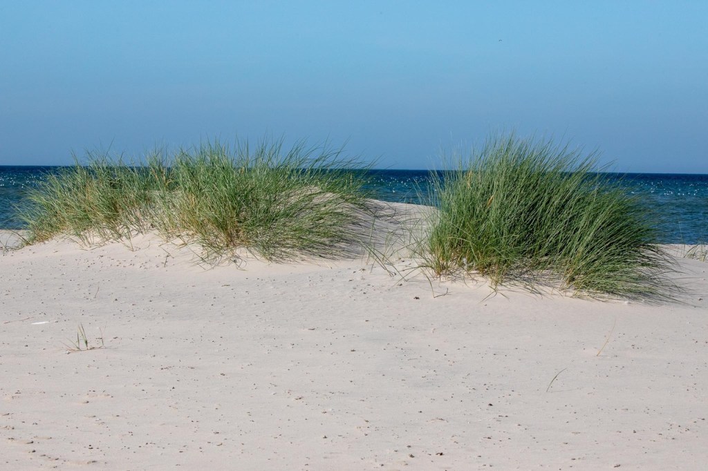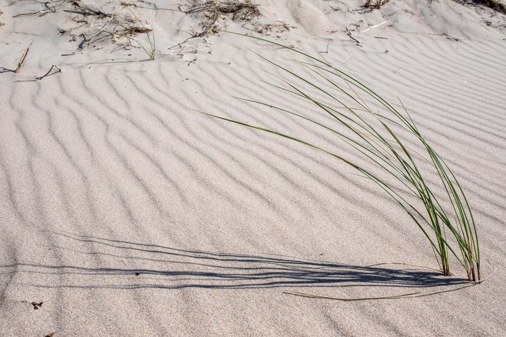 Vilopaus vid sanddynens slut, bakom skymtar äldre bevuxen sanddyn där gräs och tall kan slå rot och binda fast sanden.