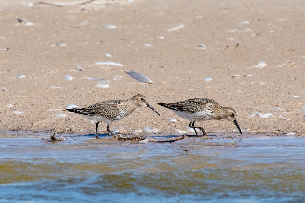 En bild på ett par kärrsnäppor, som födosöker i vattenbrynet. Dessa fåglar har flera olika dräkter och kan vara svåra att känna igen. De häckar i låglandsbiotoper och på hög höjd, på fuktiga ängar och karg tundra. Flyttar på hösten juli/augusti och vanligaste småvadaren då på vida ebbstränder. Så de verkade trivas på bredsandsudden på sandön.