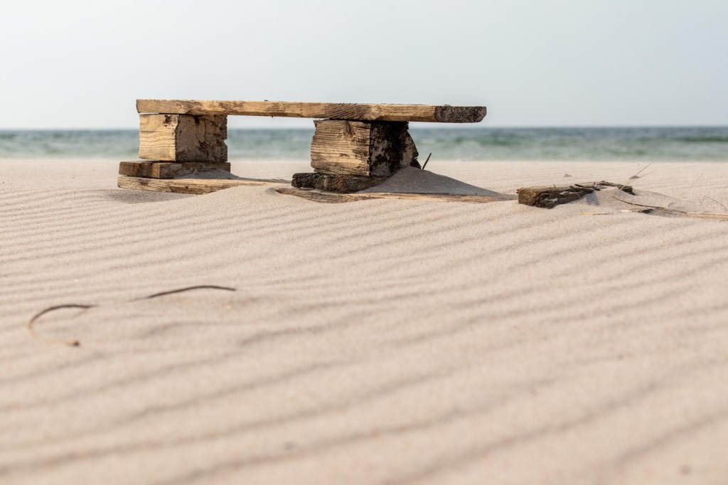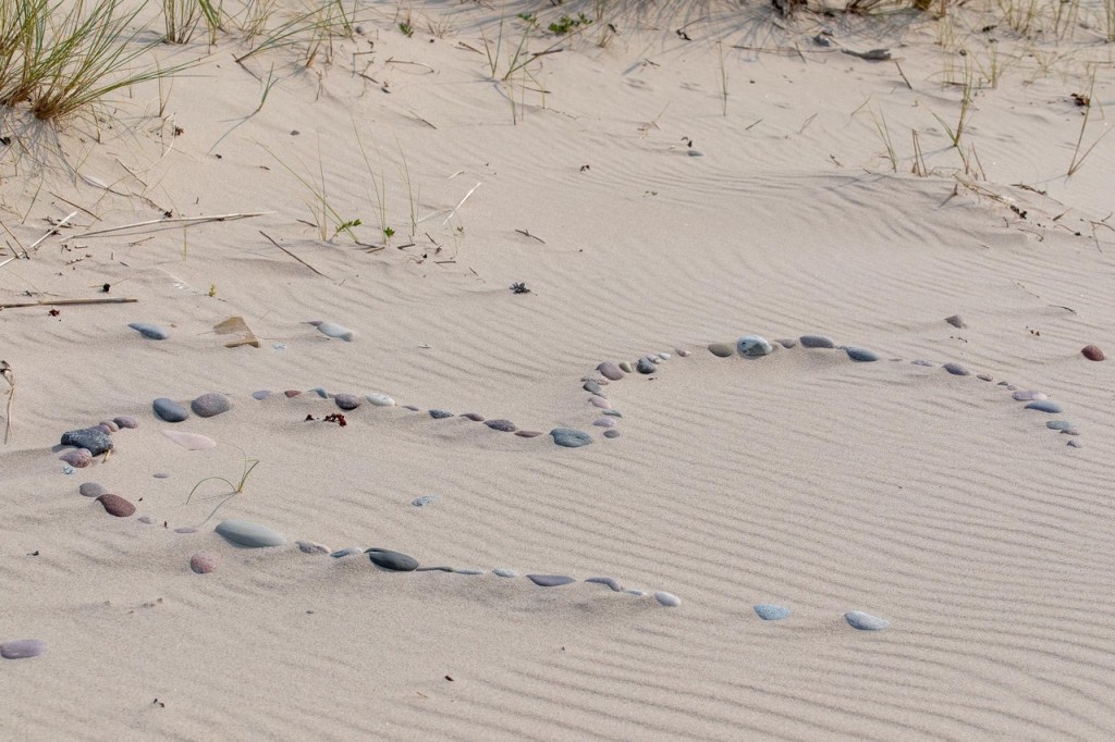 Fina mönster i orörd sand. Vi kom till en bänk där man kan slå sig ned och njuta av stillheten och lyssna på havets vågor.