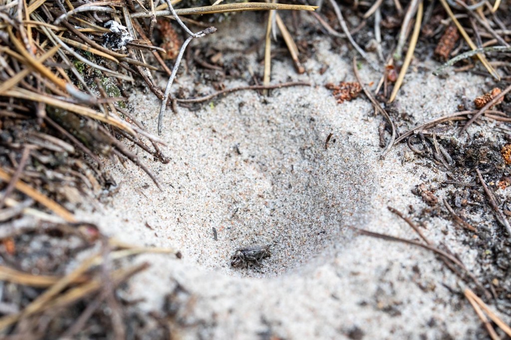 Jag hade hört talas om att det fanns lejon på ön, så jag sökte efter tecken på var de kunde tänkas bo. Jag såg sandgropar i denna slänt, kan detta vara hemvisten för myrlejonen?