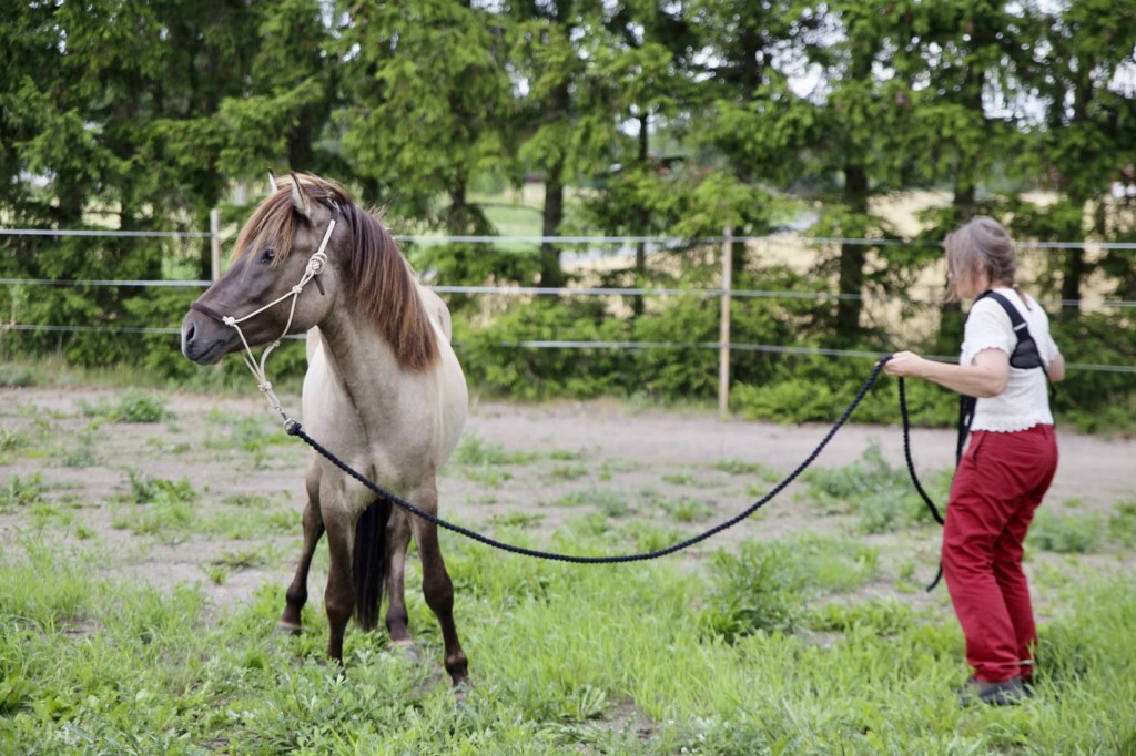 Han fick ha sin repgrimma på, sedan gjorde vi lite övningar i horsemanship med långt grimskaft. Övade start och stopp + följa john i serpentiner och volter. Märker att han föredrar vänster varv.