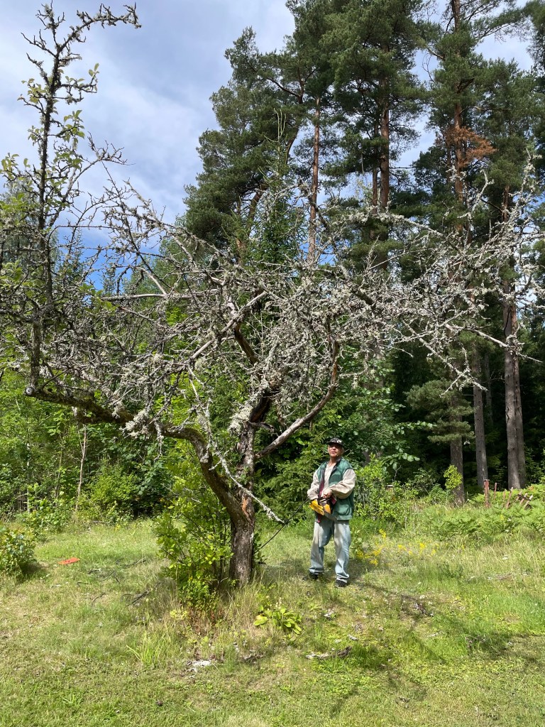 Vi sov gott och var utvilade på morgonen nästa dag, så efter frukosten fortsatte vi med trädgårdsarbetet. Vi rensade bort det mesta av riset och pinnarna som vi röjt undan för att frilägga fruktträd som blivit inträngda av snöbärsriset mot skogen. En hög ask som vi tyckte växte för nära huset tog vi ner stegvis genom att kapa ett par meter upp först med hjälp av stege. Fällningen gick bra även om jag kände mig lite nervös.